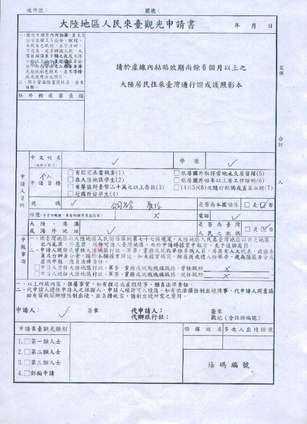 填写《大陆地区人民来台观光申请书》并需要本人签字。(按模板自行打印填写) |